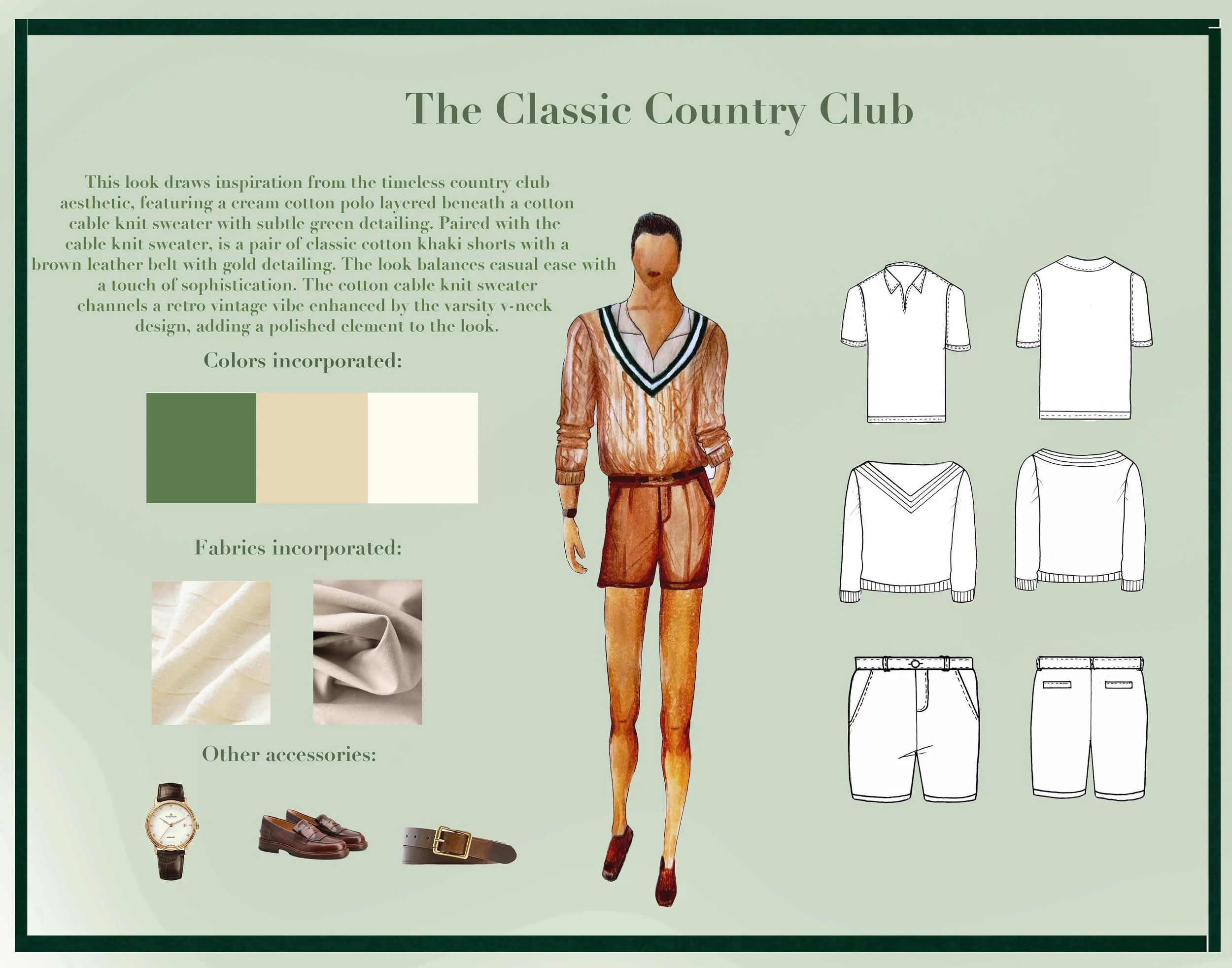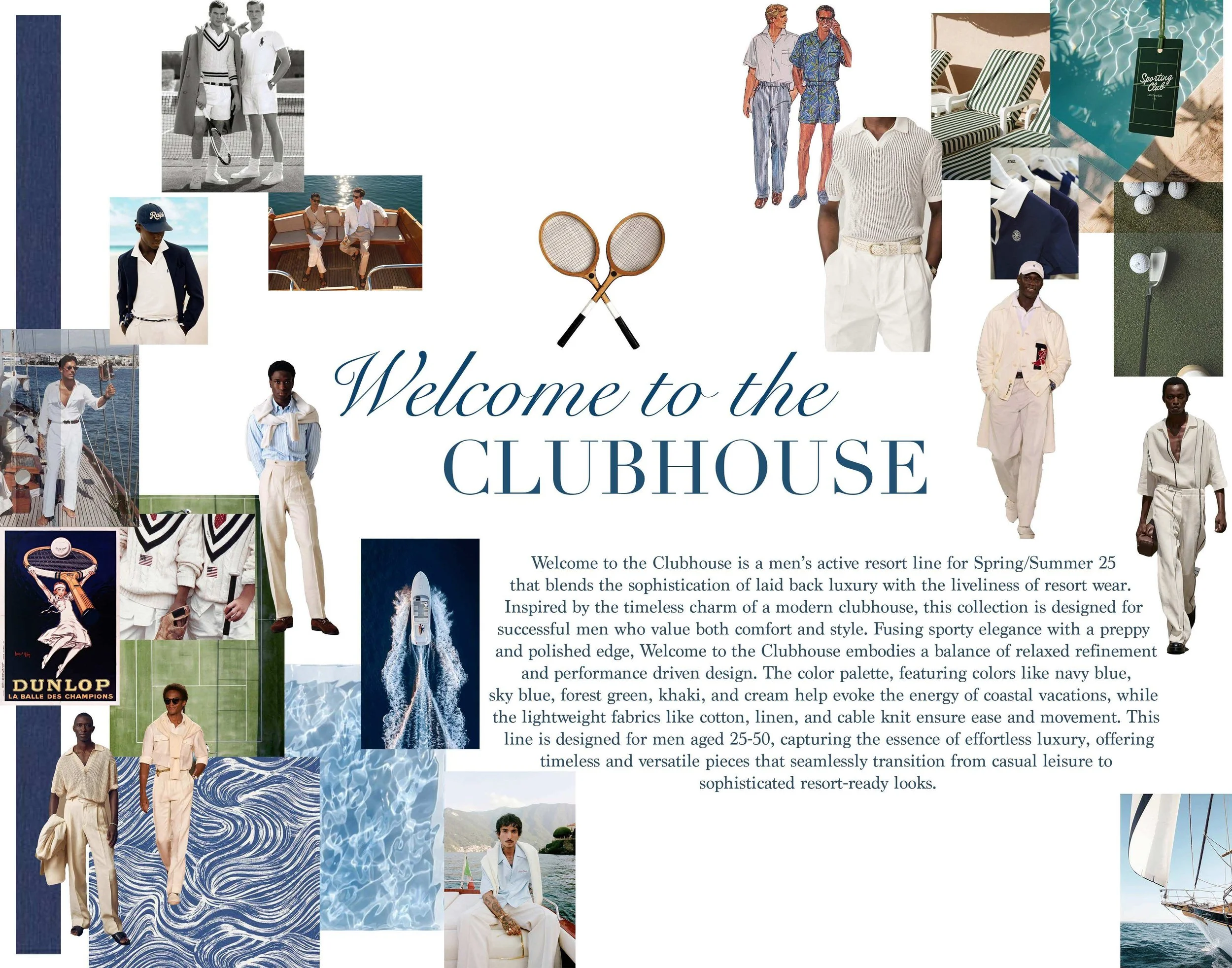 Welcome to the Clubhouse is a men’s resort wear illustration project inspired by the timeless charm of coastal leisure and modern sophistication. Designed for the Spring/Summer 2025 season, the collection blends sporty elegance with refined tailoring, featuring lightweight fabrics like cotton, linen, and knits. With a palette of navy, cream, and forest green, it captures the effortless luxury of seaside living through versatile, polished designs made for the modern gentlemen.